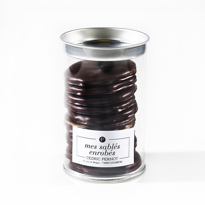 Sablés bretons enrobés de chocolat noir ou chocolat au lait.